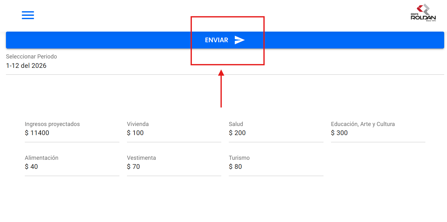 Luego de ingresar los valores necesarios presione el botón "ENVIAR"