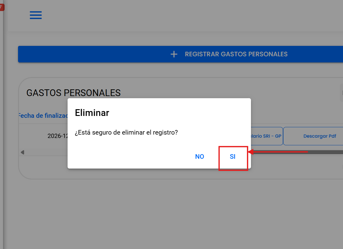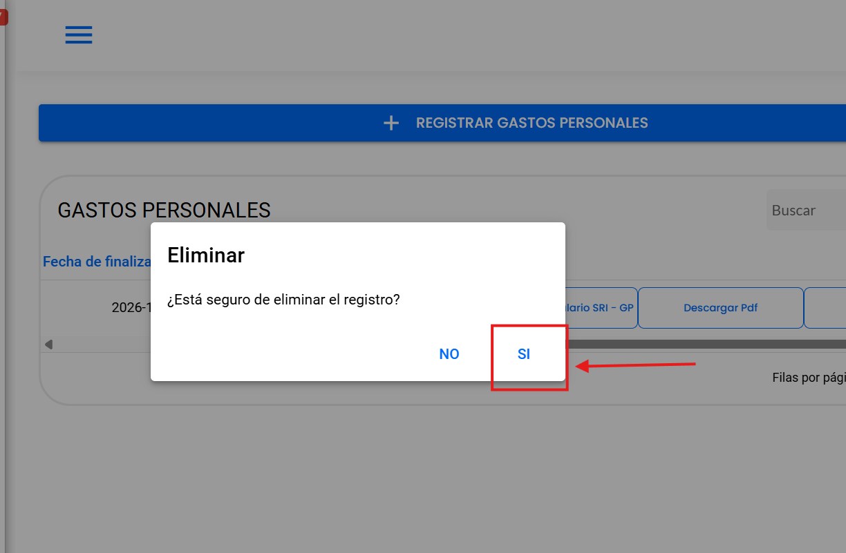 2. Puede eliminar el registro si lo prefiere, para esto presione el botón "Eliminar"