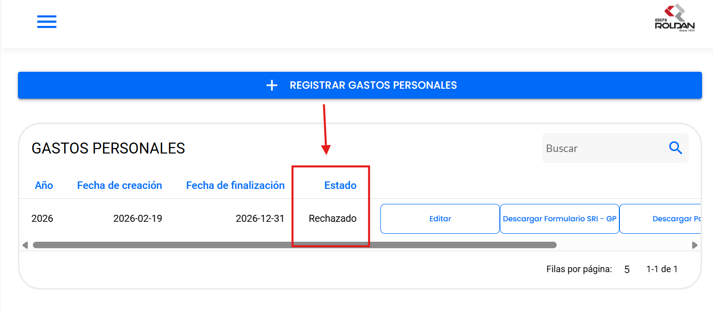 1. En caso de que se rechace, el estado cambiará a "Rechazado"