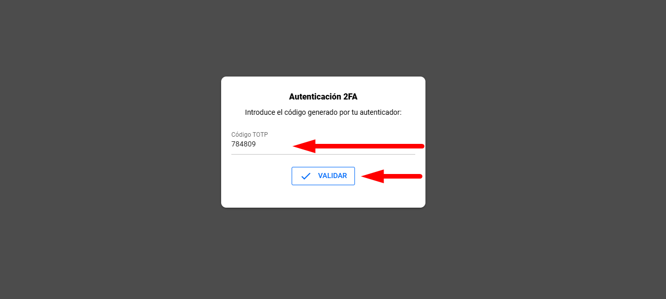 - Ingrese el código generado por el autenticador y realizar clic en el botón de VALIDAR.